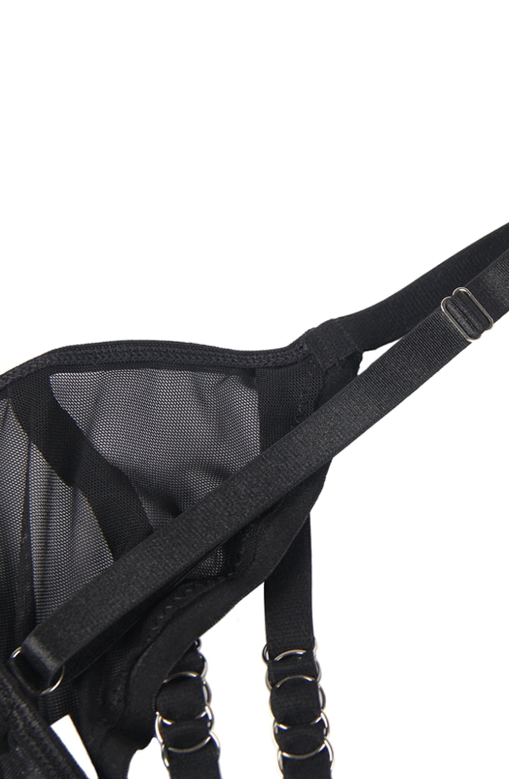 Black bra and brief set. The bra is decorated with a ring design and is not underwired. Fully adjustable for perfect fit. Item arrives packaged.