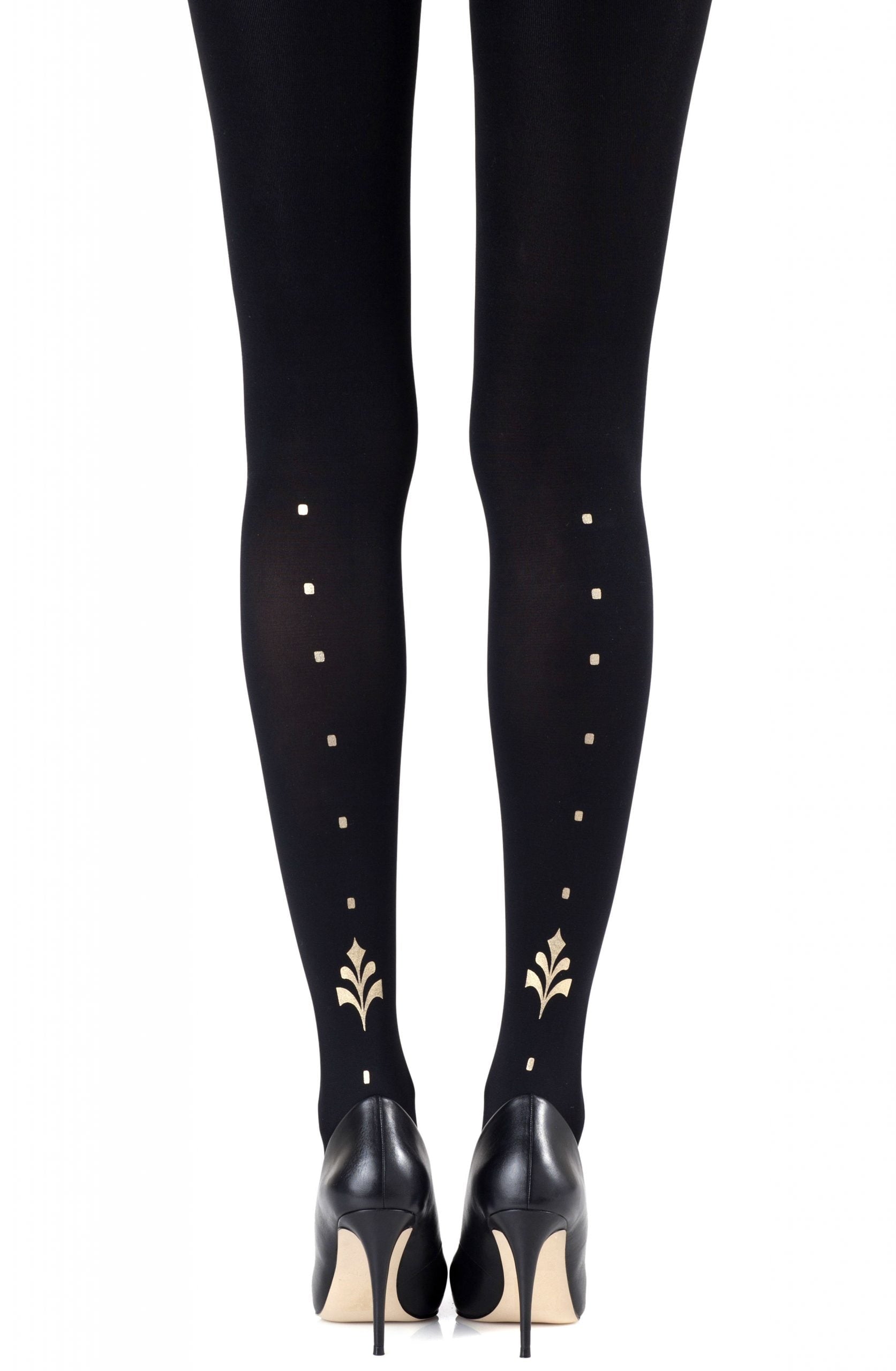 Subtle yet sexy the Dot Calm tights feature a reversible metallic print that will give you just the right amount of style. Colour: Black tights with Gold print. Thickness: 120 denier. No doubt you will shine with our metallic prints. Please note that these prints require extra care when washing and will naturally fade with wear. Unless they have X-ray vision no one will be able to see through these opaque tights. Is the party in the front or the back? You choose with reversible tights where to place all the fun. Hand print no two are the same.
