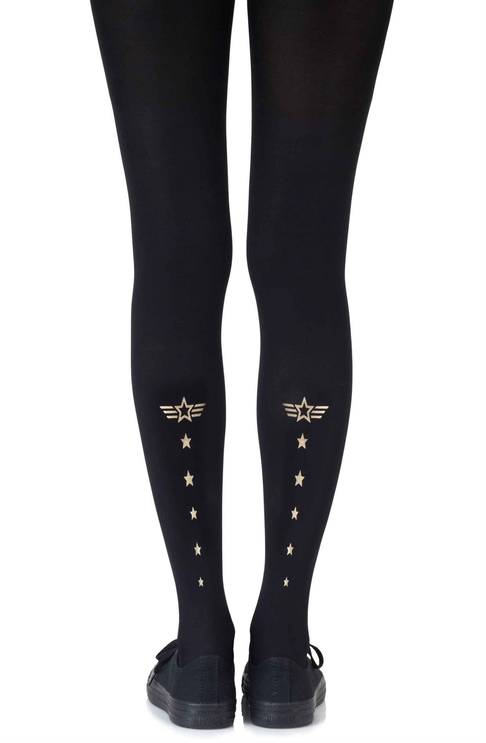 Wear your wings with pride with the Top Gun tights that feature a reversible pilot badge graphic. Colour: Black tights with Gold print Thickness: 120 denier. No doubt you will shine with our metallic prints. Please note that these prints require extra care when washing and will naturally fade with wear. Unless they have X-ray vision no one will be able to see through these opaque tights. Is the party in the front or the back? You choose with reversible tights where to place all the fun. Hand print no two are the same.