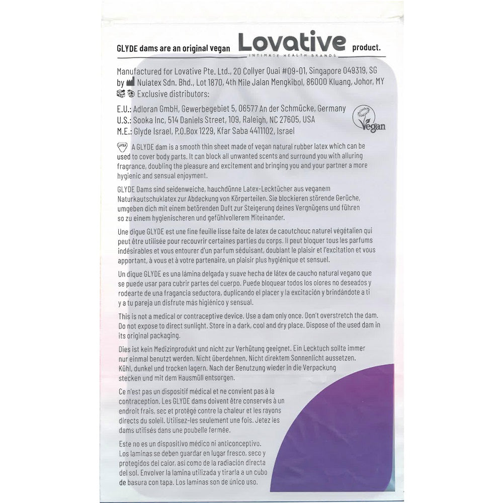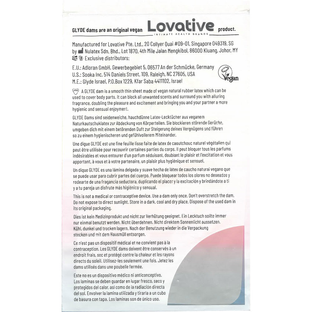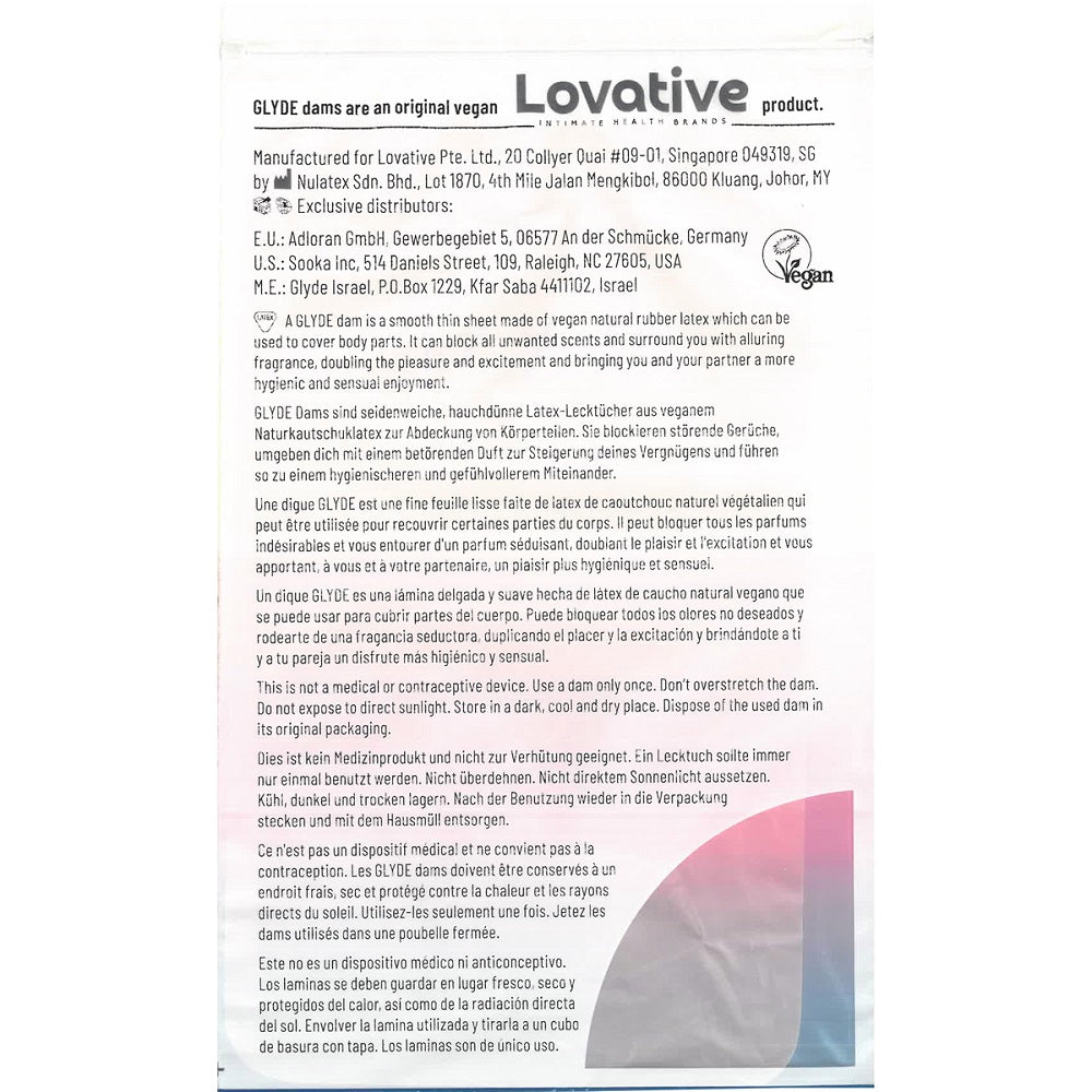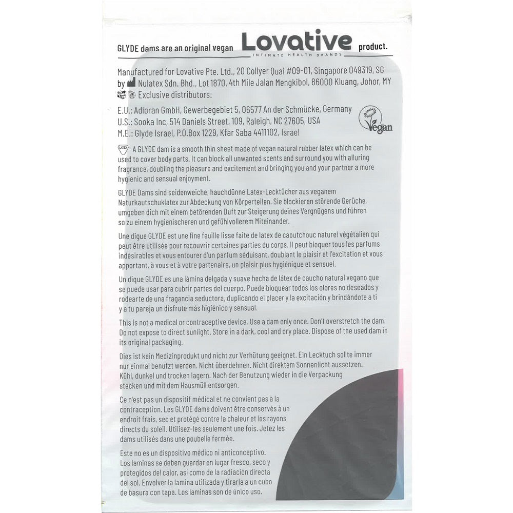 Glyde Dams are a smooth thin sheet made of vegan natural rubber latex which can be used to cover body parts. It can block all unwanted scents and surround you with alluring fragrance, doubling the pleasure and excitement and bringing you and your partner a more hygienic and sensual enjoyment.